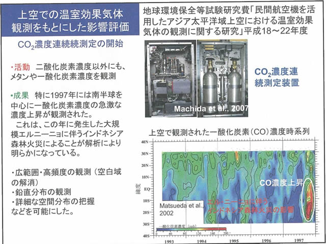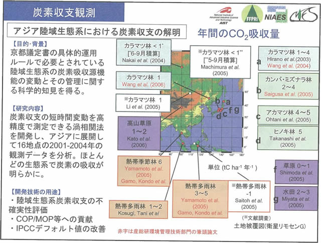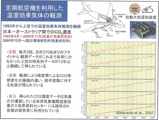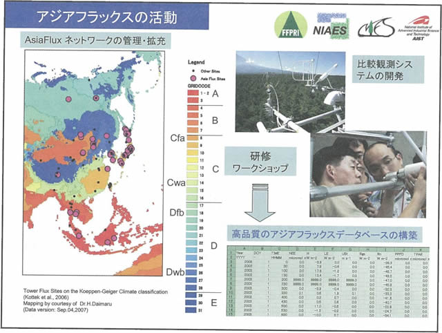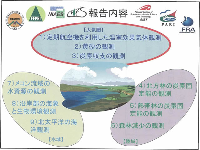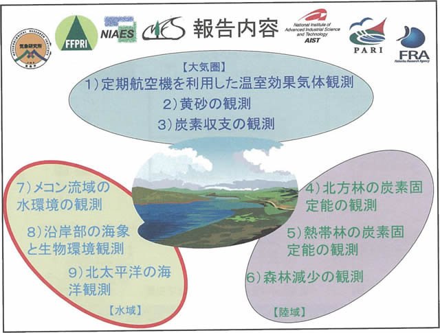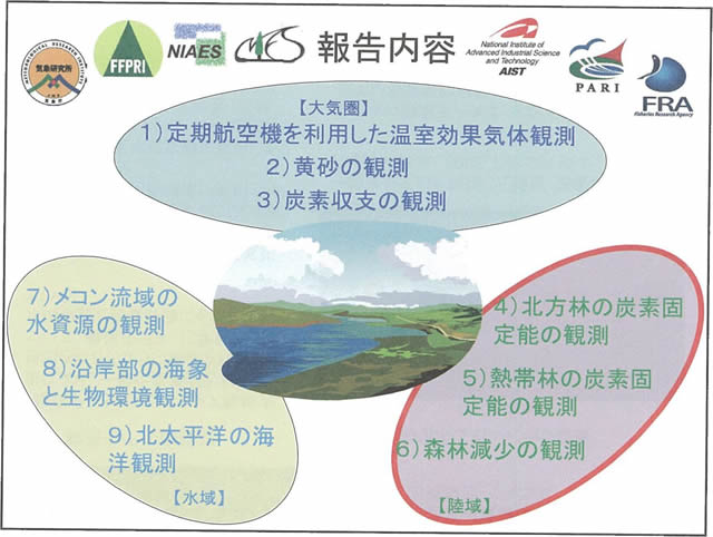 気候変動は地球規模の大きな国際的問題となっていますが、その変動の起源と影響を受ける場所、また気候変動を緩和させる空間はさまざまな様相を呈し、時間的にも変動しています。そのため、世界的には60以上の国と40以上の国際機関が参加して、全球地球観測システム(GEOSS)の活動を推進しています。日本の環境研究機関も、GEOSSの活動を視野に入れつつ、互いに連携を持ちながら、得意とする分野またアジア太平洋地域において中心的な役割を担い、大気、陸域、海洋のモニタリングにかかわる国際的な研究協力活動を推進して成果をあげています。