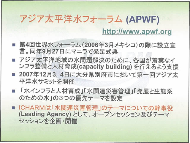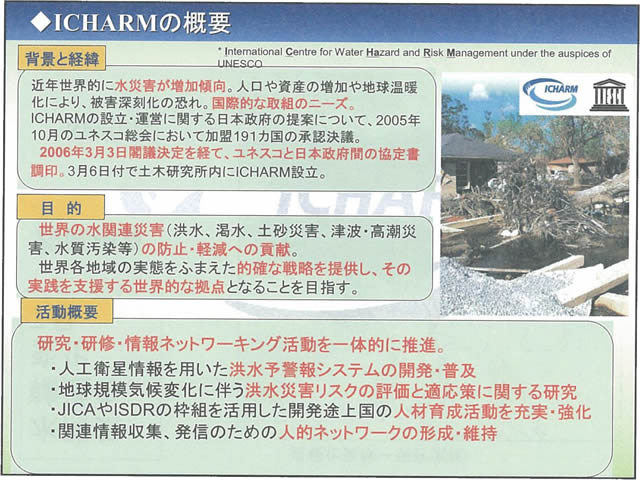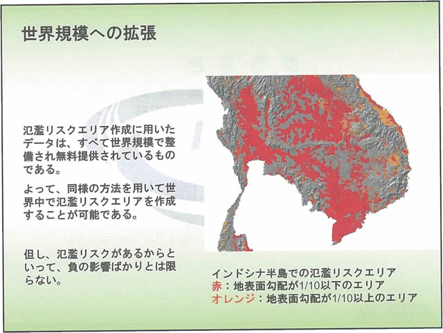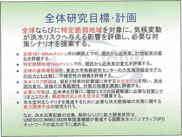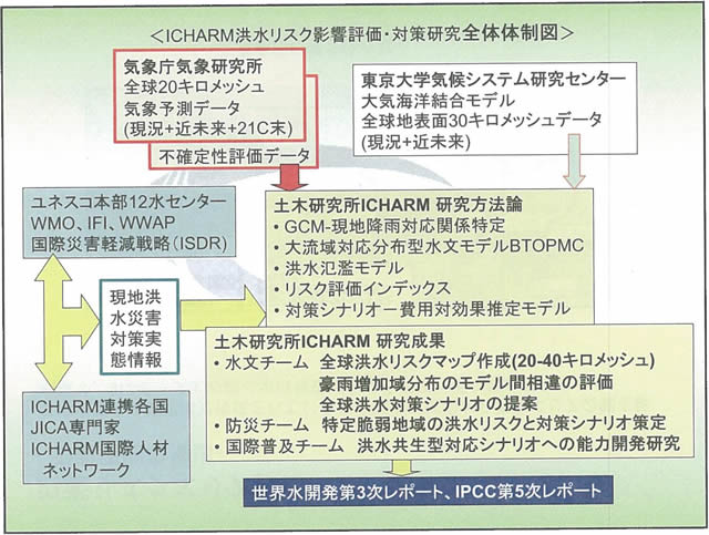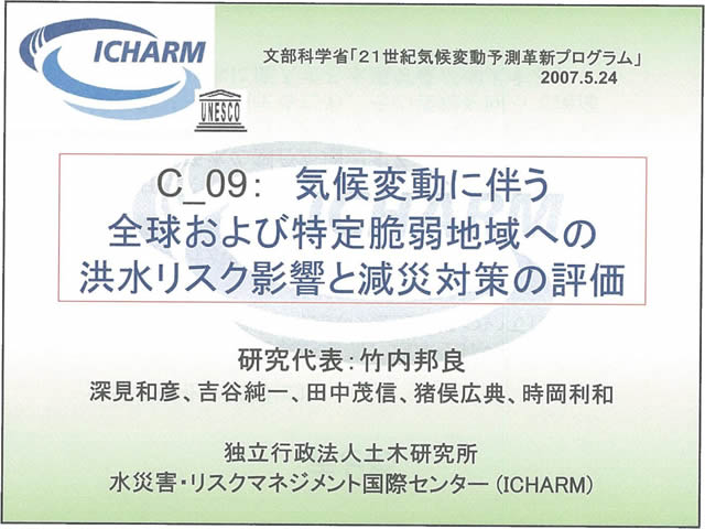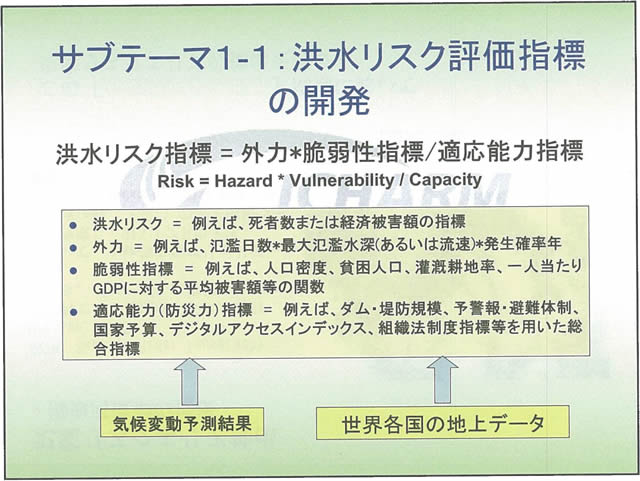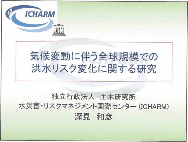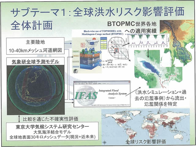 気候変動に伴う全球規模での洪水リスク変化に関する研究…気象研究所等と連携して実施中の気候変動による世界規模での洪水リスクの変化予測を行う研究を紹介する。超高解像度大気モデルによる温暖化予測と分布定数型の最新の洪水解析技術を地球規模で組み合わせるところに特徴がある。