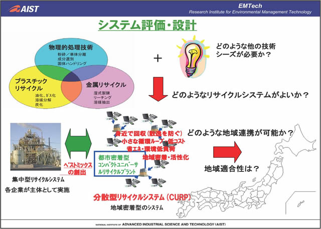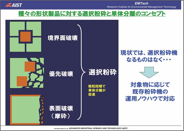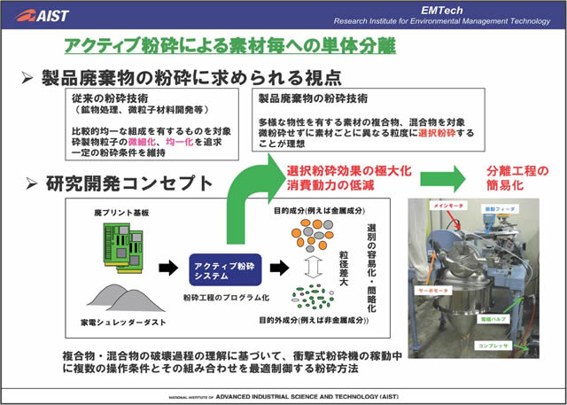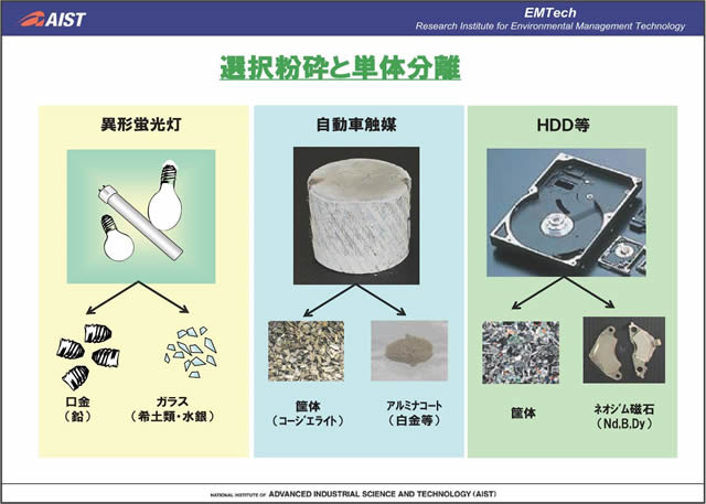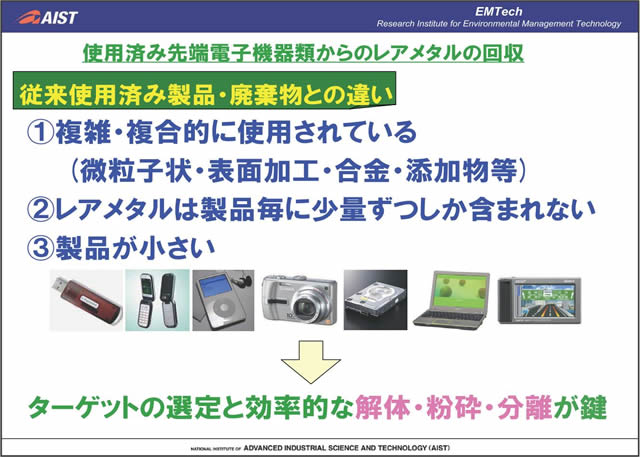 実際に使用済み電子機器等から希少金属のリサイクルを行っていく際には、電子機器内で希少金属が複雑・複合的に利用されていること、製品ごとに含まれている量が少ないことなどから、ターゲットの選定と効率的な解体・粉砕・分離がリサイクル実現の鍵となる。(独)産業技術総合研究所では、粉砕・分離・再資源化の各要素について、新しい技術を一貫して開発し、コンパクトかつユニバーサルなリサイクルシステム実現のための取り組みを行っている。本発表では、リサイクルシステム技術開発の実例について紹介する。