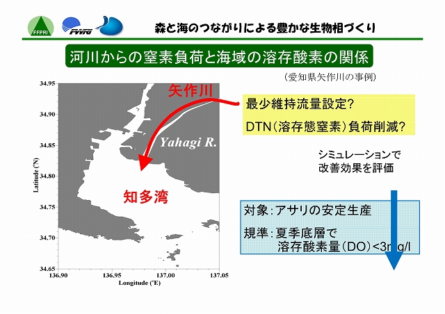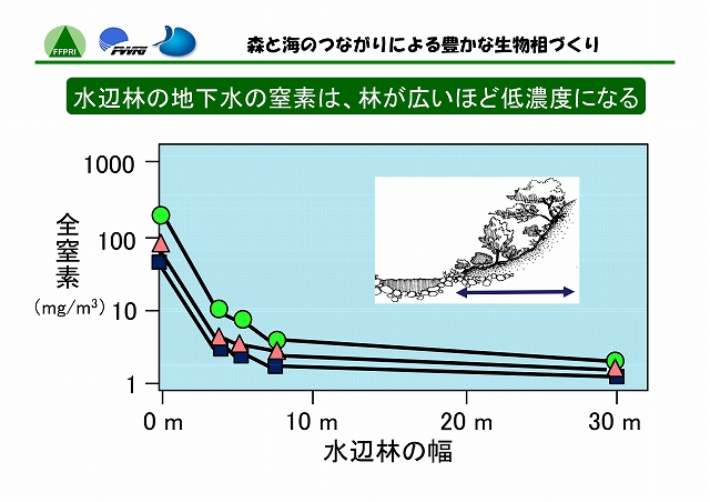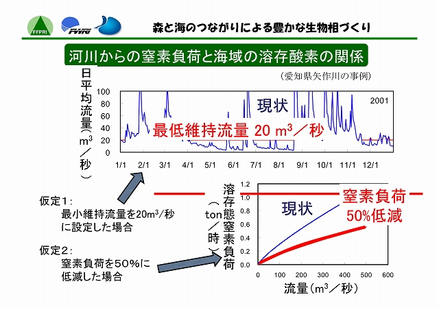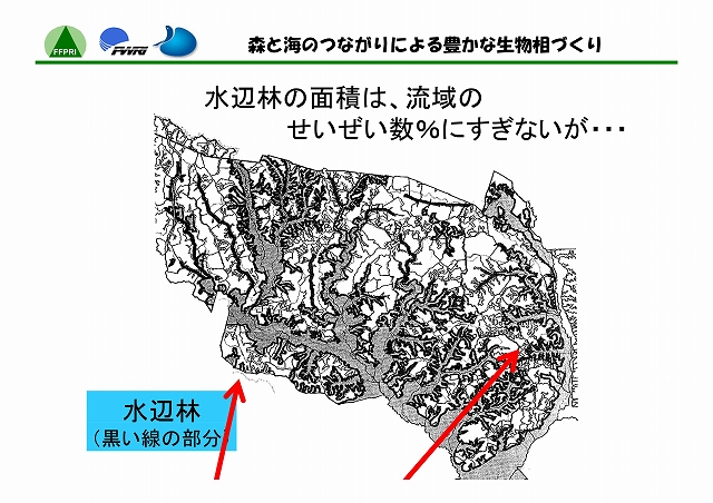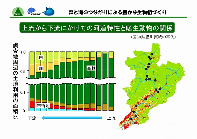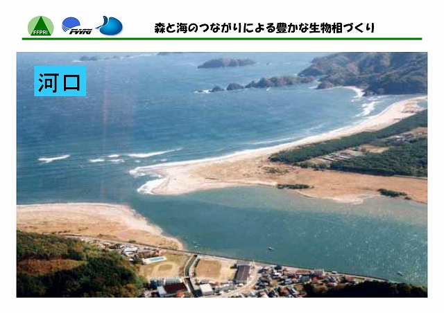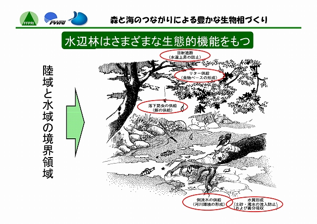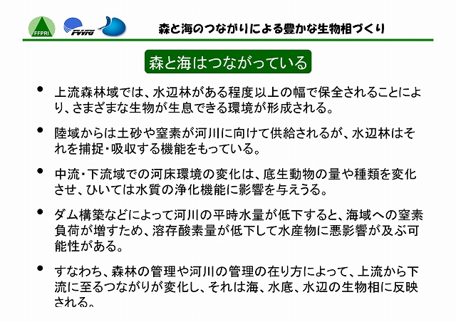 陸には陸の、海には海の生態系がある。しかし、両者はたがいに独立した存在ではない。河川を通じて両者の間には物質や生物の移動があり、それぞれに影響をおよぼしあっている。最上流の森林域では、渓流へ砂礫、栄養塩類、有機物等が流入する。それらの量・質は、降水量に応じて変化するだけでなく、水辺林がよく保全されていればその機能によって適度に調整される。中流・下流域では、上流からの物質の供給量のみならず、河川の管理方法によっても、底生動物のバイオマスや種類などが変化する。そして、流れの行きつく先の海洋、とくに内海や内湾では、河川からの流量や栄養塩類負荷によって生物の生息環境が左右されることになる。このように、沿岸海域の環境は、流域を貫く河川周辺の自然管理のあり方と密接に関わっている。したがって、陸域と水域の生物相を豊かに保つには、両者の間のつながりを意識した森林及び河川の管理が必要である。