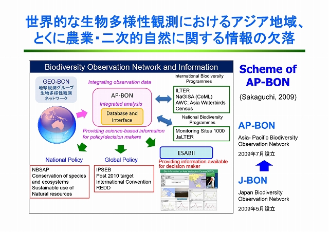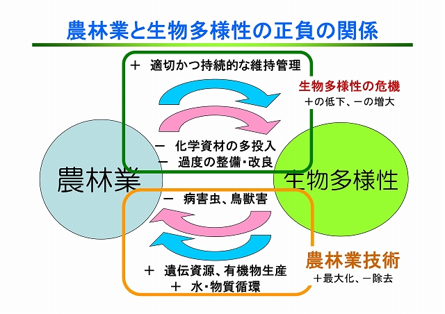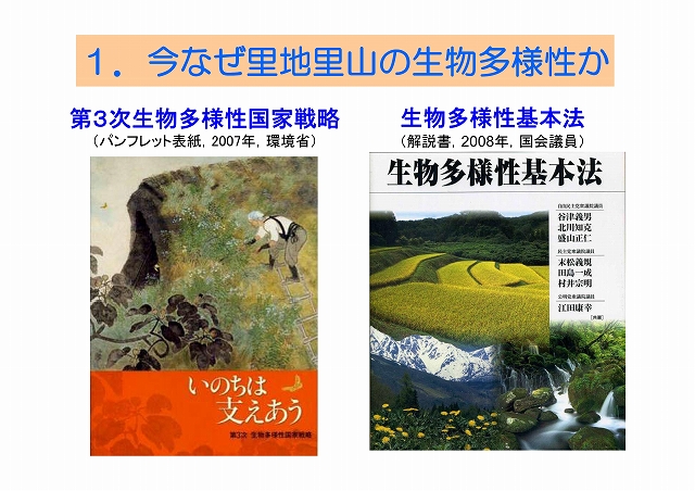 来年10月、名古屋で「生物多様性条約」の第10回締約国会議が開催される。本会議は2010年目標を検証するのみでなく、次の中期目標を議論する重要な場となる。我が国では自国開催のCOP10に向けて様々な施策が展開されているが、なかでも我が国の生物多様性の重要な位置を占める里地里山や農林業をはじめとする第一次産業に注目が集まっている。本報告では、なぜ今里地里山なのか、そこでは何が生物多様性の危機をもたらしているのか、それをどのように再生するのかについて、最近の農業環境技術研究所、森林総合研究所の取り組みを紹介しながら概括する。
