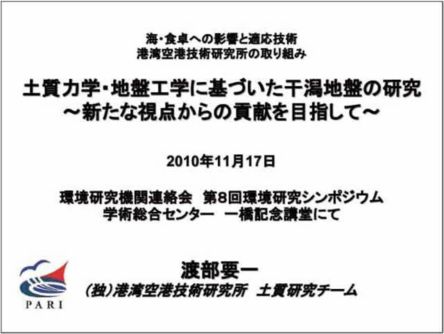 | 発表者:独立行政法人水産総合研究センター 中央水産研究所 海洋生産部 部長中田 薫 独立行政法人港湾空港技術研究所 地盤・構造部 地盤研究領域 土質研究チームリーダー渡部 要一 |