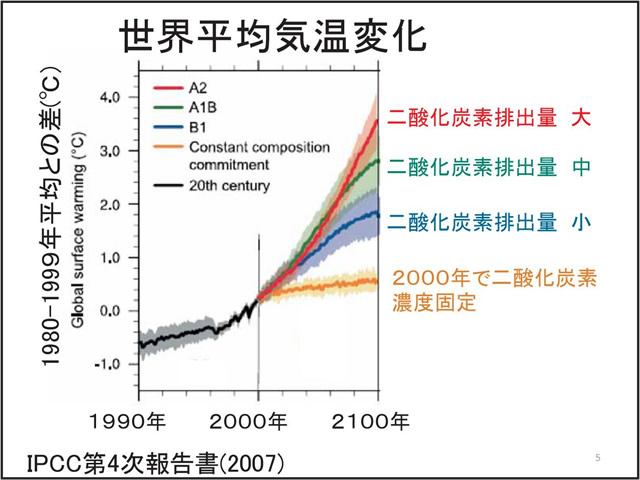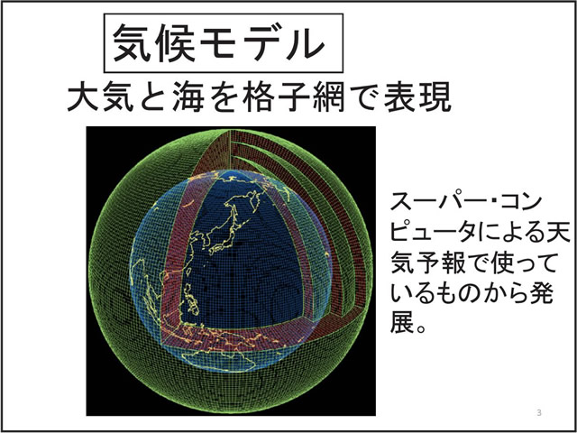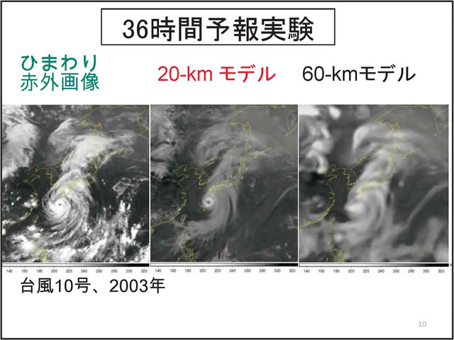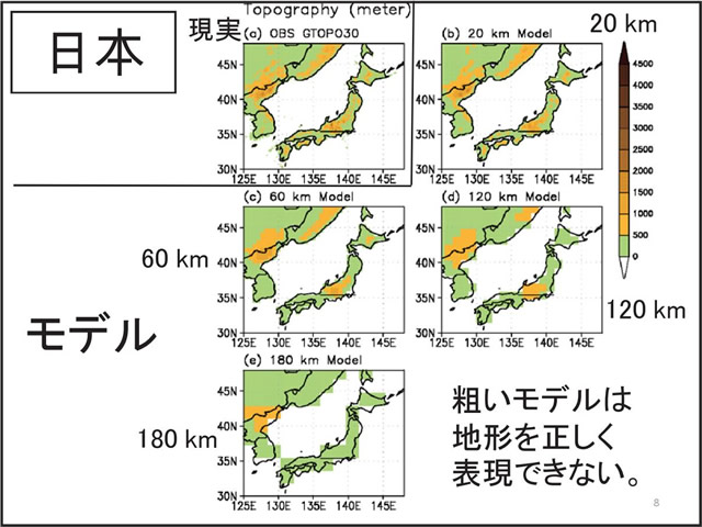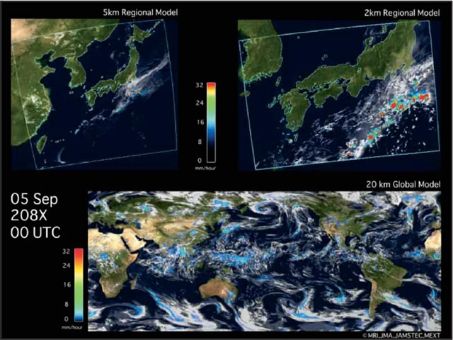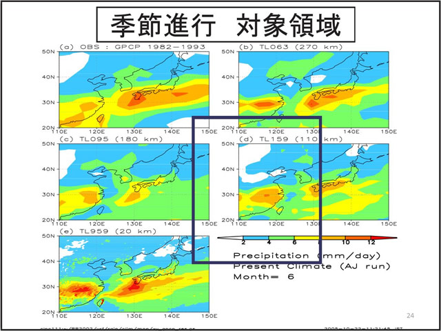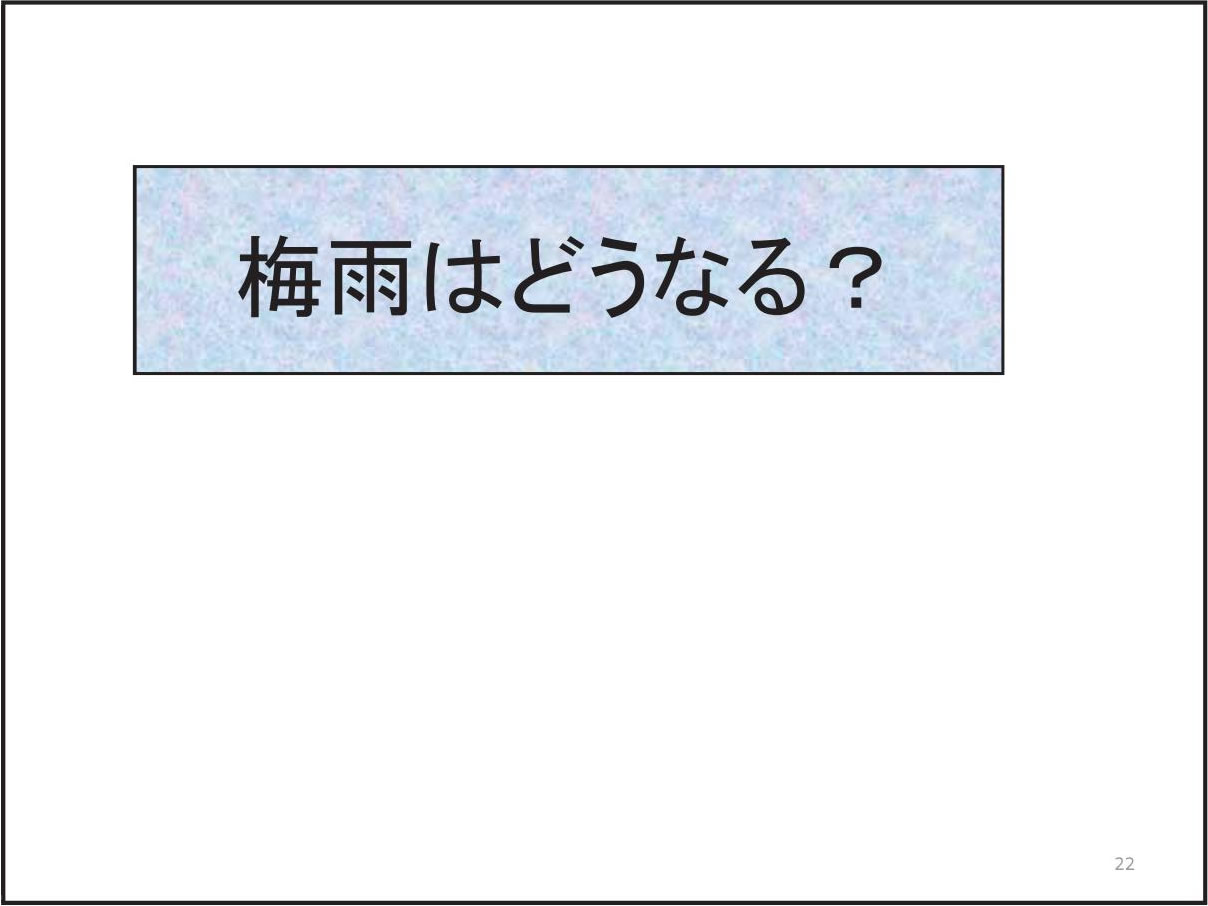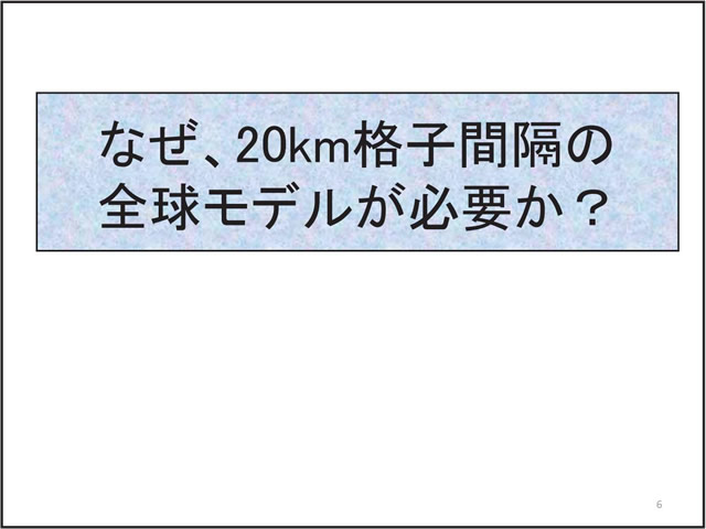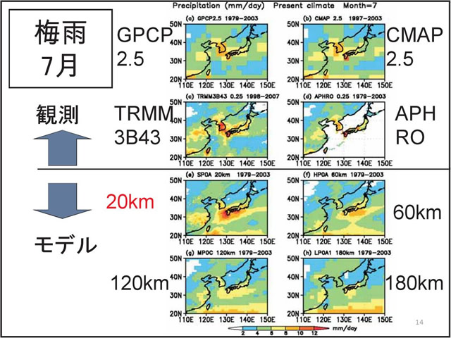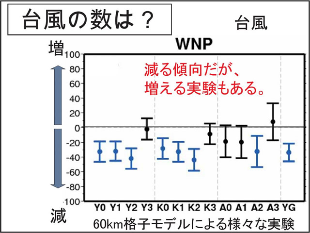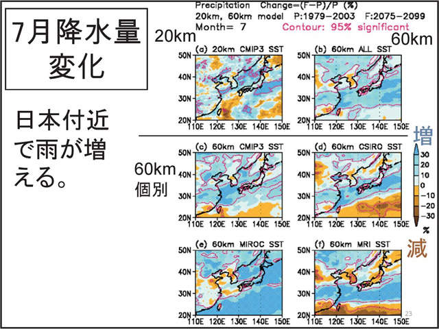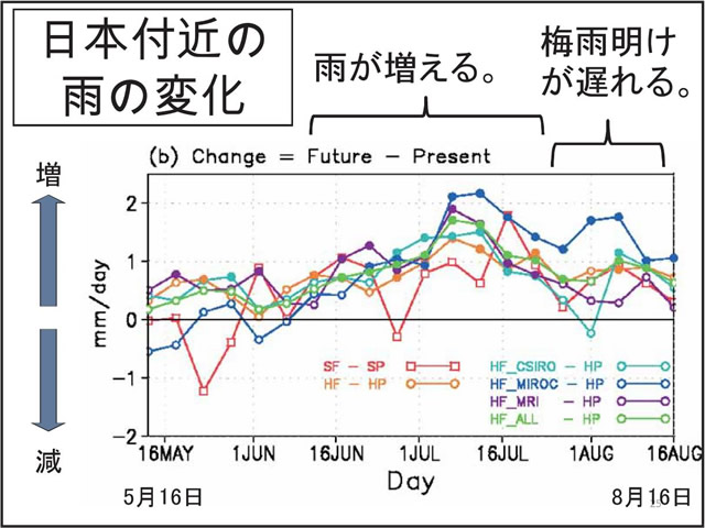 日本の気候にとって台風や梅雨の変動は非常に重要である。しかし、温暖化予測に一般に使われている気候モデルでは、大気の水平分解能が低く、台風や梅雨を再現することが難しい。そこで、気象研究所では、「地球シミュレータ」というスーパー・コンピュータを用い、20km格子の全球大気モデルで温暖化予測実験を行っている。このモデルは、現実的な台風や梅雨を再現することができる。地球が温暖化すると、台風の数は減る傾向にあるが、強い台風が増える。梅雨期の降水量は増え、梅雨明けが遅れる可能性がある。