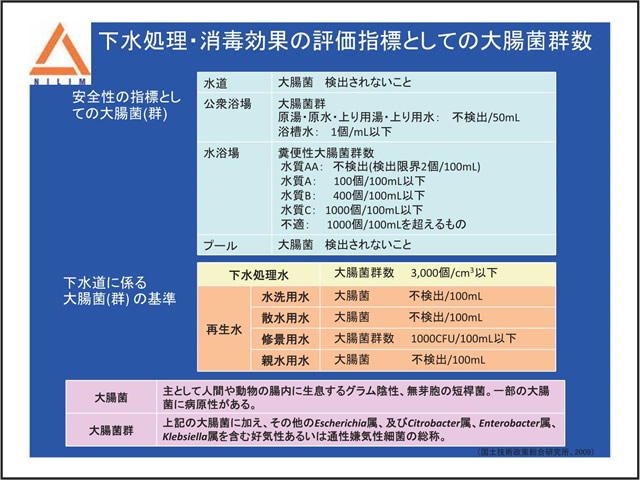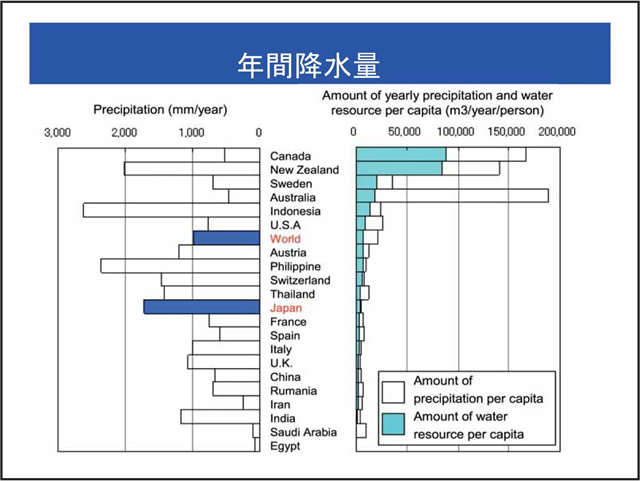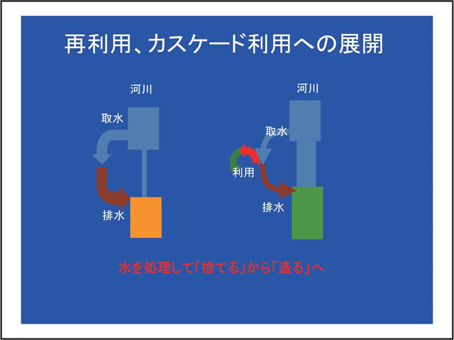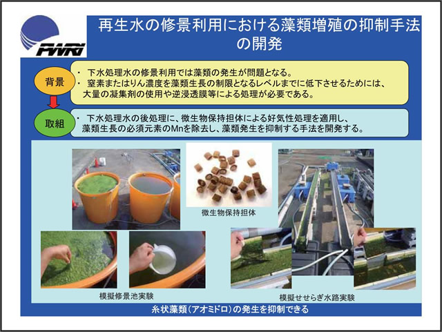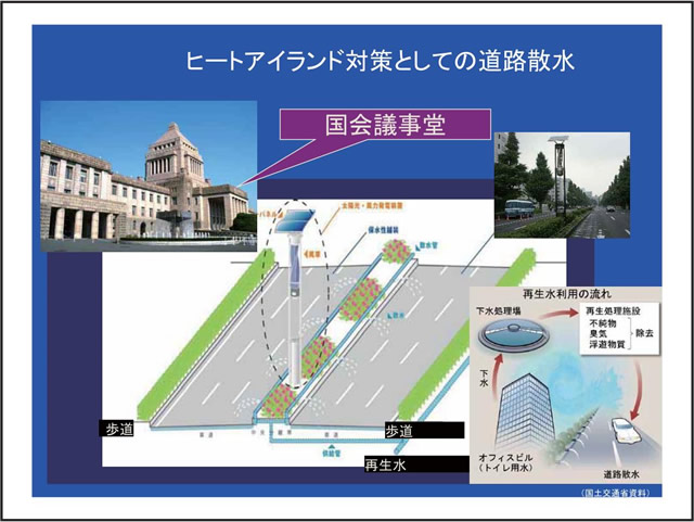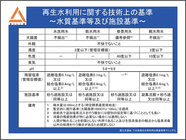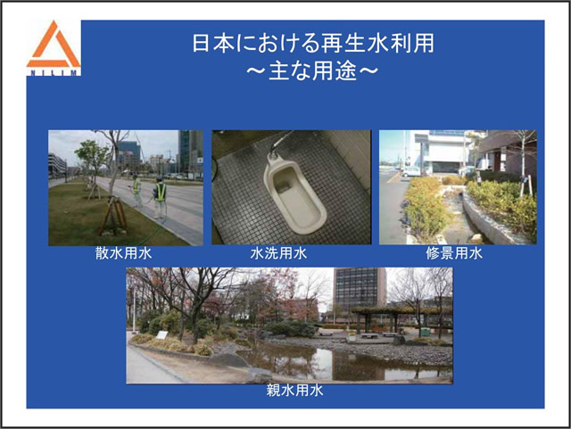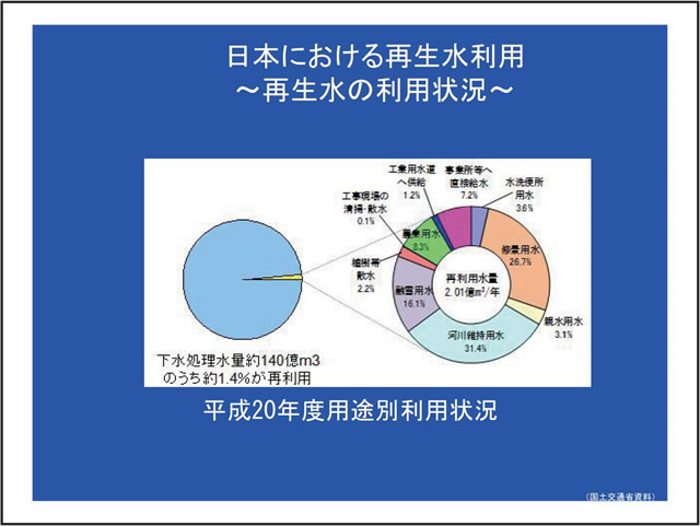 日本の年平均降水量は世界平均の約2倍の量となっているが、人口1人当たりの水資源賦存量は世界平均の半分以下と言われている。また、年平均降水量の経年変化では小雨年と多雨年の開きが次第に増加し、渇水年の年降水量が現象する傾向にあり、水資源確保の重要性が高まってくるものと予想されている。日本では1978年の異常渇水を機に、福岡市において1980年に水洗用水として再生水の利用が大規模に開始されて以来、水洗用水、融雪用水、環境用水、工業用水、散水用水等様々な用途に再生水が利用されるようになってきている。都市内における貴重な水資源確保の観点、さらにヒートアイランド対策としての打ち水利用など新たな利用用途も期待される等、再生水利用の重要性は今後益々高まっていくことが予想されている。そこで、再生水利用の実態やその適切な利用に向けた研究状況について紹介する。