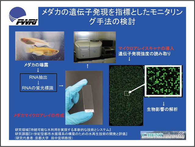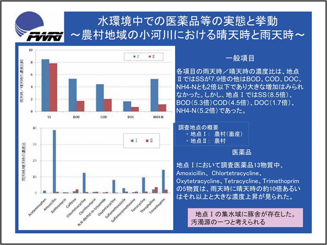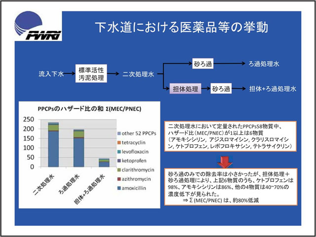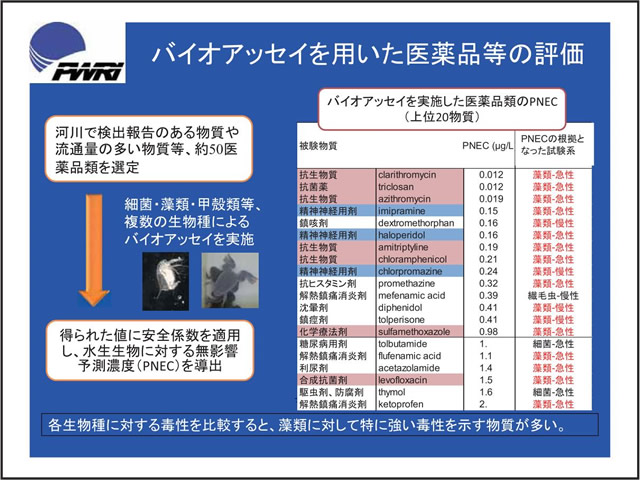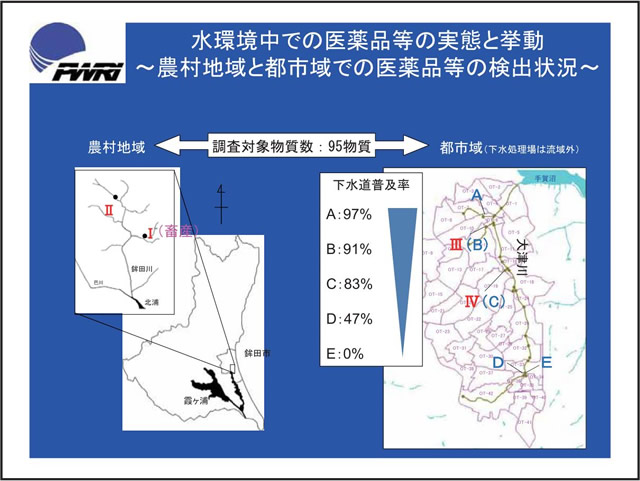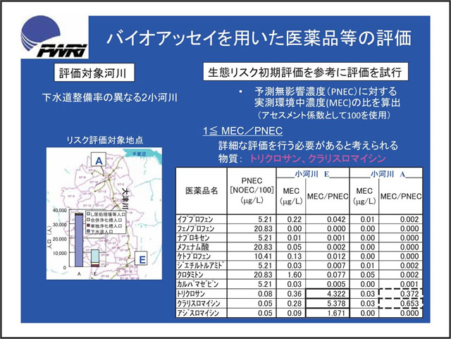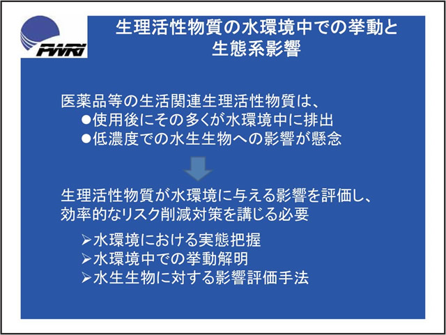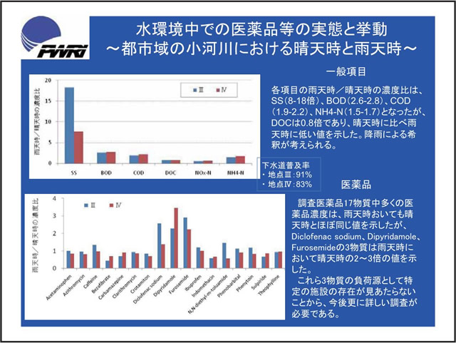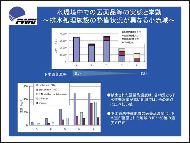 また、我々は日常の生活で様々な化学物質を使用しており、その種類は年々増加している。その中で、人が服用する医薬品は体内で代謝されたのち排泄物とともに排出される。これら医薬品等は生理活性作用を持つことから、低濃度での水生生物への影響が懸念されている。そこで、生活排水の処理状況が異なる都市域の小河川における医薬品等の存在実態を把握し、集水域の生活排水の処理状況と医薬品存在濃度の関係について明らかにするとともに、その存在濃度の生態リスク初期評価を試行した成果を紹介する。