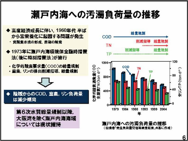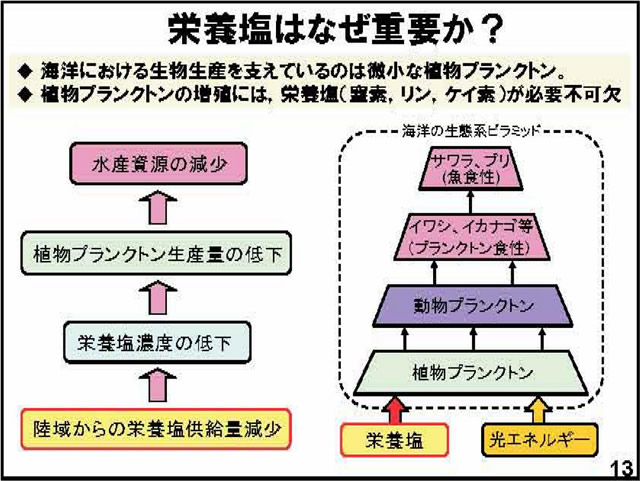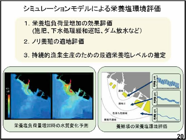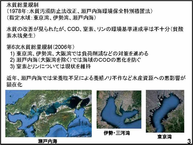 水質汚濁防止法では瀬戸内海、東京湾、伊勢湾が水質総量規制の対象となっており、一定の水質改善が見られている。その一方で、瀬戸内海においては栄養塩不足によるノリ不作が顕在化している。講演では、陸域からの栄養塩負荷が定次生態系に及ぼす影響について概説するとともに、瀬戸内海において栄養塩共有の低下がノリ養殖などの水産業に与えている負の影響について述べる。さらに、陸域から供給される栄養塩の有効利用など、水産資源にとって最適な栄養塩環境を維持するための対策についても述べる。