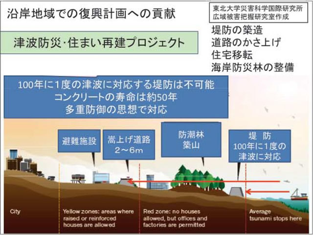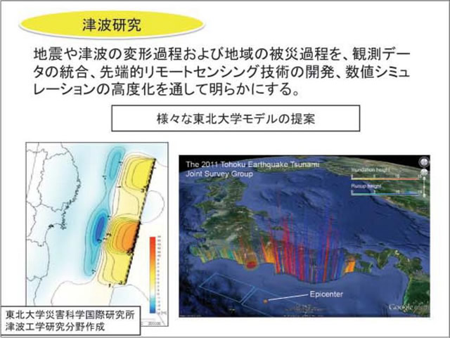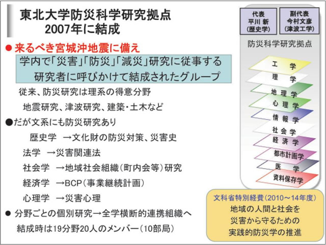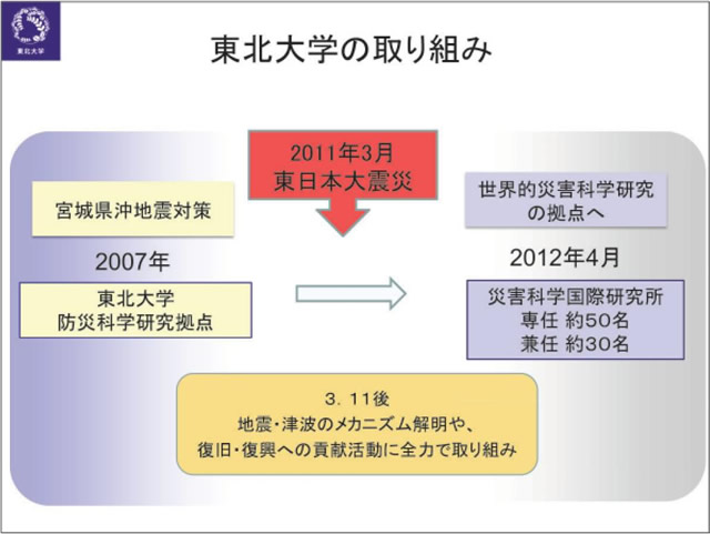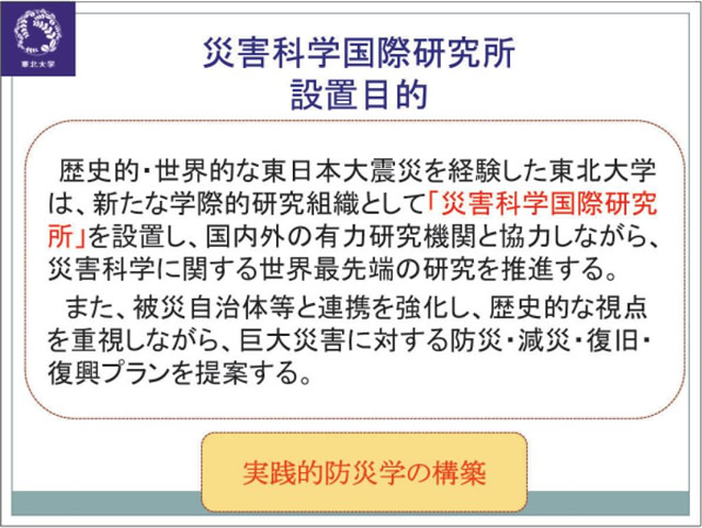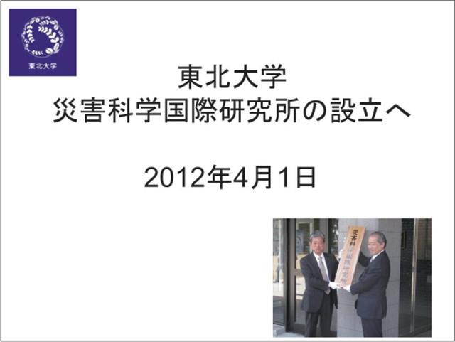 東北大学は2012年3月11日の東日本大震災をうけて、本年4月1日に災害科学国際研究所を設置しました。研究所は7部門36分野からなります。理系・医学系から文系まのでの幅広い 分野の研究者が結集しました。平常時にはとても実現不可能なこうした態勢が整ったのは、全学をあげて東日本大震災の被害に立ち向かい、被災地の復旧・復興に貢献しなければならないという強い意思があったからです。