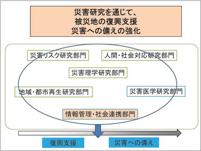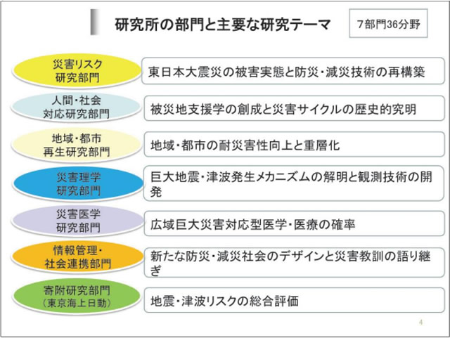 研究所を構想するにあたっては、災害の全サイクルに対応できるような部門・分野の構成とすることを心懸けました。地震・津波の発生メカニズムから、地震警報・津波警報の精度向上や効果的な情報の出し方を研究する分野。地震・津波の被害の調査研究を行い、地震・津波対策を研究して社会の防災力を高める研究分野。被災した人々を救済する災害医学の分野も大切です。人間や社会に焦点を当てて、人間の心理や文化、歴史、社会システムのあり方などから災害研究にアプローチする分野も設けました。