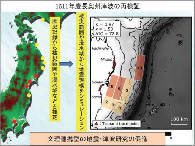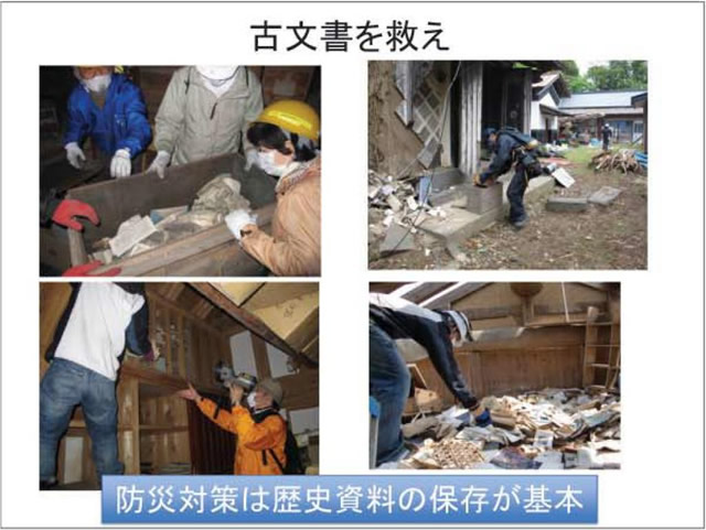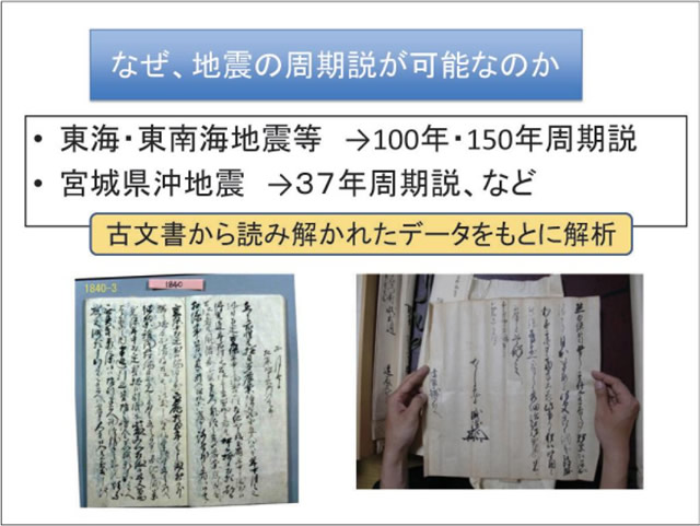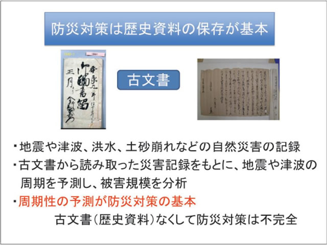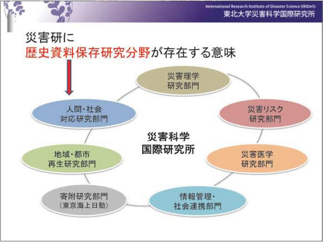 文系の分野の一つとして、私が専門とする「歴史資料保存研究分野」を立てました。なぜこ うした分野が災害科学に必要なのでしょうか。歴史学は過去の古文書に書かれた諸種の記事を分析して、地域の歴史、日本の歴史を解明していますが、地震や津波、風水害など自然災害に関連する記事も記されています。とくに地震・津波の記事は、各地域の地震・津波の周期性や被害規模を想定する根本史料となります。古文書の記録から算定された地震・津波の周期性をもとに社会は災害対策を進めます。古文書なくして防災対策は不完全になってしまうのです。歴史を知り歴史を学ぶことが災害への備えを促すという、文理連携研究も本研究所では推進していきます。