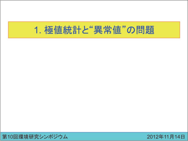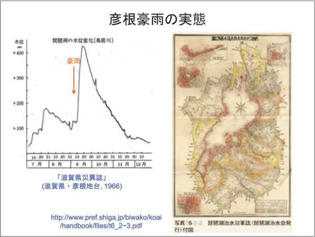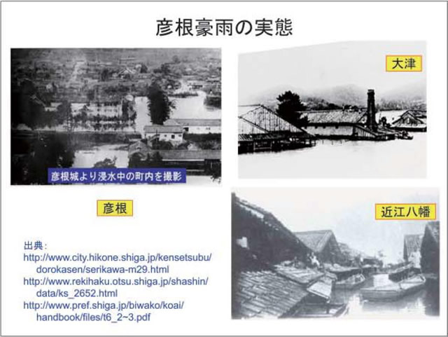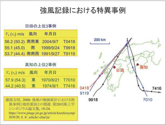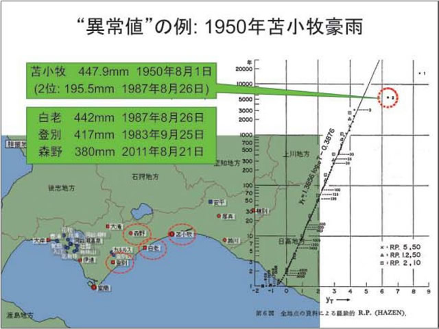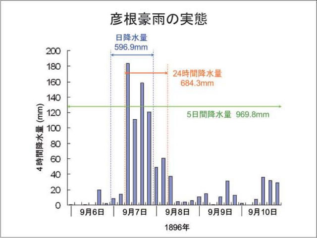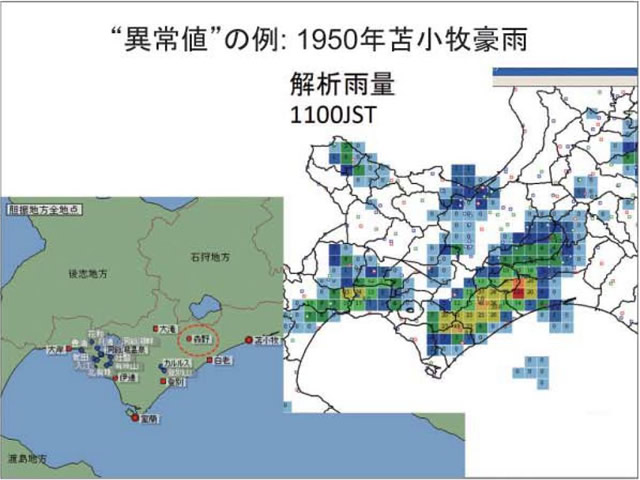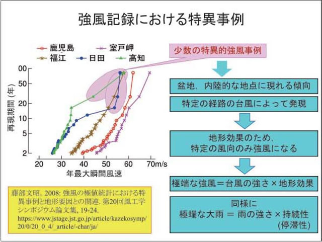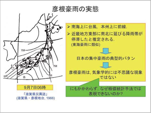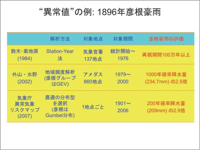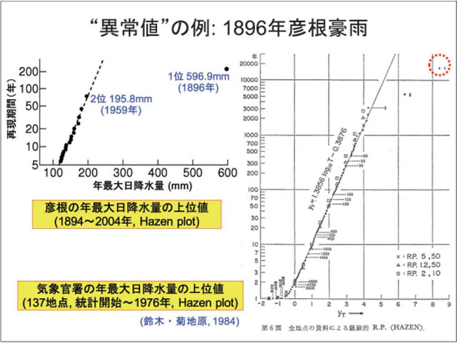 しかし、時として極値分布から外れる観測値が現れることがある。例えば、1896年に彦根で観測された日降水量596.9mmは、20世紀以降のデータから計算される再現期待値を大きく超える。こうした特異事例の存在は、極値統計手法の数学上の前提に比べ、自然の変動が複雑多彩であることを反映すると考えられる。極端に大きい日降水量が現れるのは、雨の強さと持続性(停滞性)という2つの要素が重なった場合であり、このような気象学的情報を極値の評価にどう反映させるかが課題であろう。