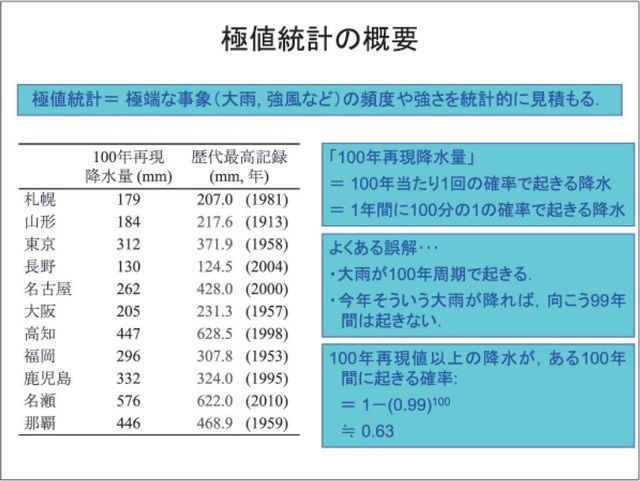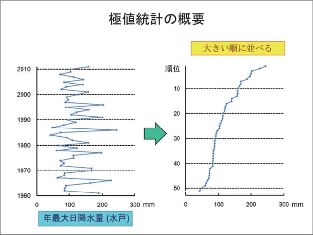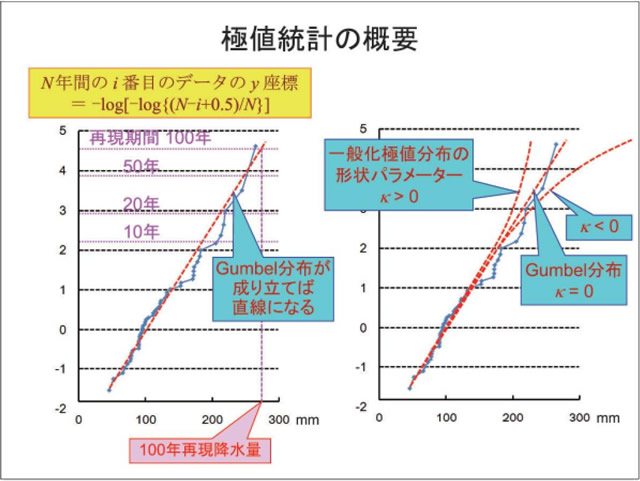 大雨・強風など極端な事象の強度や頻度を観測データから推定するために、極値統計手法が使われる。極値統計手法では、観測データにGumbel分布や、これの拡張である一般化極値分布(GEV)等の極値分布関数を当てはめて再現期間(ある値の事象が、何年に1回の割で起きると予想されるか)や再現期待値(50年、100年に1回の確率で起きると予想される降水量はどれほどか)を推定する。