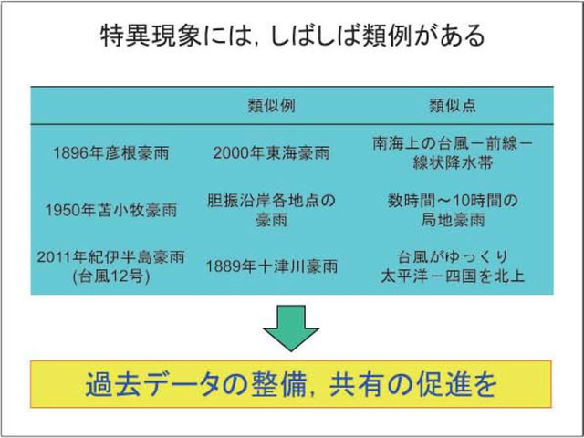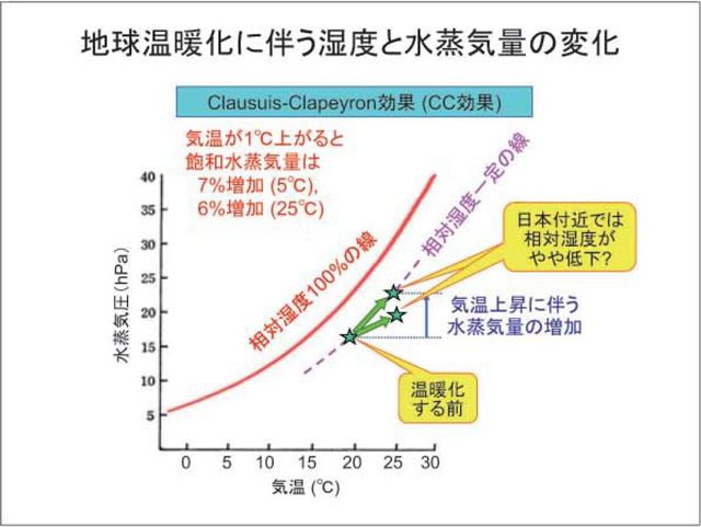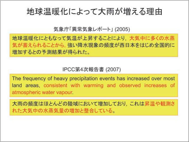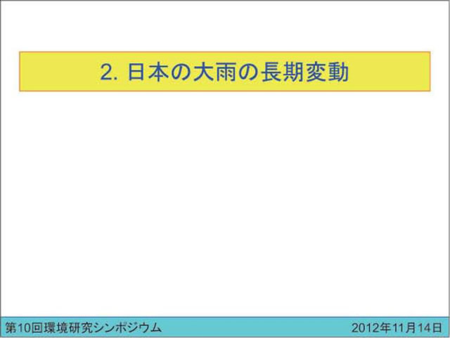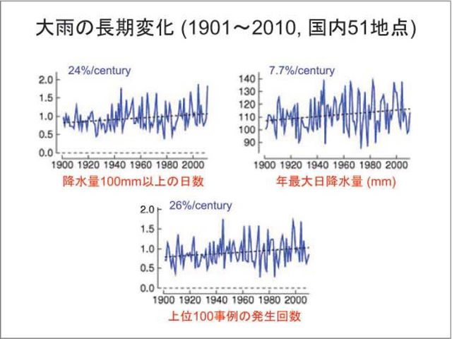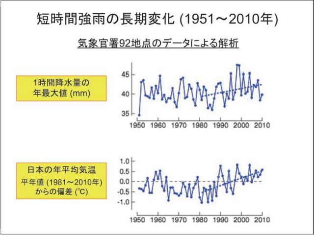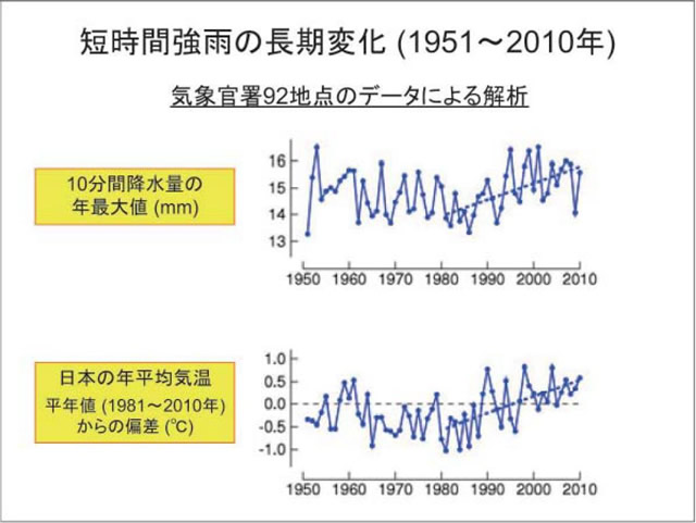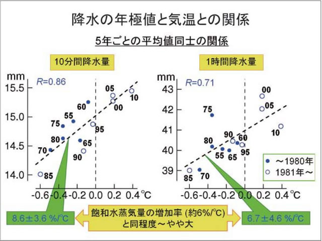 長期的な気候変動という観点から見ると、大雨や強い降水は世界的に増える傾向にあり、その主因は気温の上昇に伴う水蒸気量の増加にあると考えられる。日本でも、過去100年余の日降水量データから、大雨の頻度や強さの増加傾向が確認される。また、1980年代以降は気温の上昇が顕著になり、1時間、10分間という短時間強雨の増加傾向が見られる。極端事象の発現頻度や長期変動をより精度良く評価するため、過去のデータや付随情報の整備・共有の促進が望まれる。