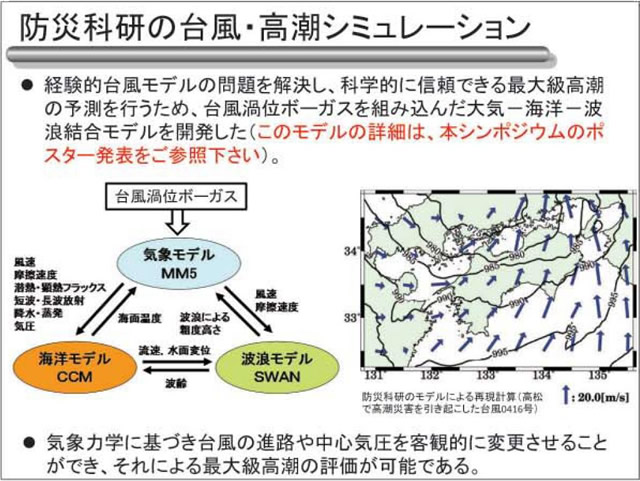 防災科学技術研究所では、科学的に信頼できる最大級高潮の予測を行うため、台風渦位ボーガスを組み込んだ大気-海洋-波浪結合モデルを開発した。そして、現在気候および地球温暖化を想定した将来気候(2099年9月時点)の下で東京湾および伊勢湾において発生可能な最大級の高潮の予測を行った。