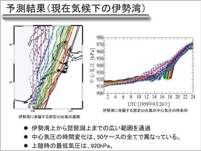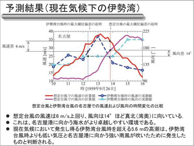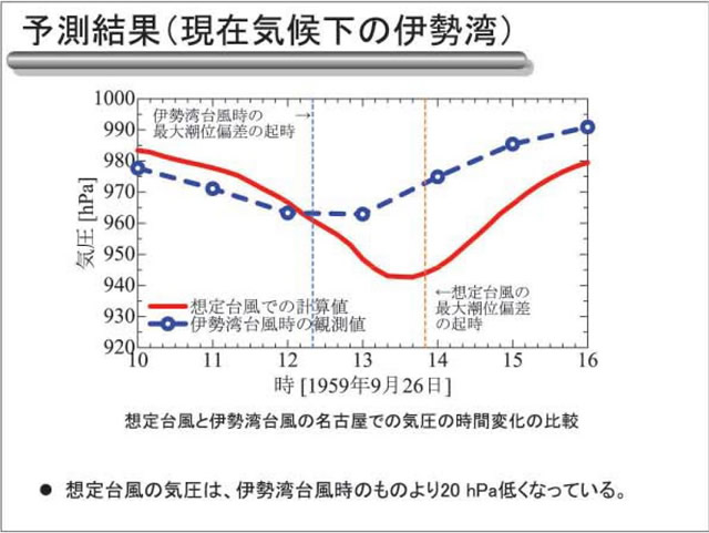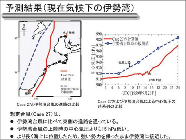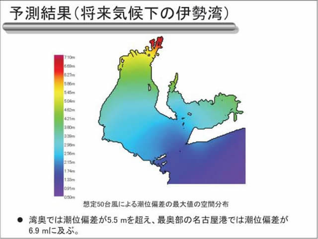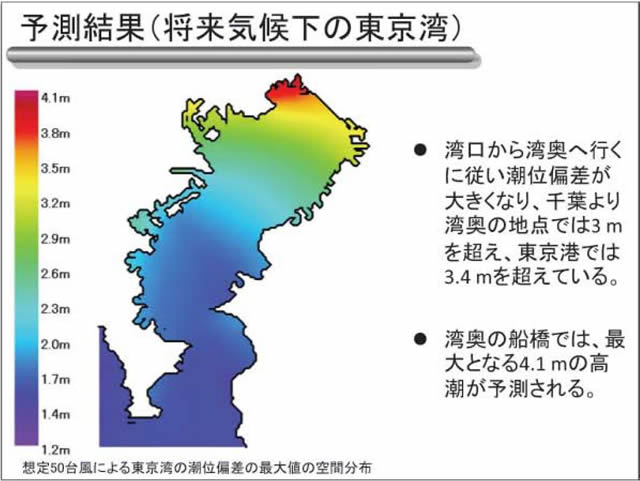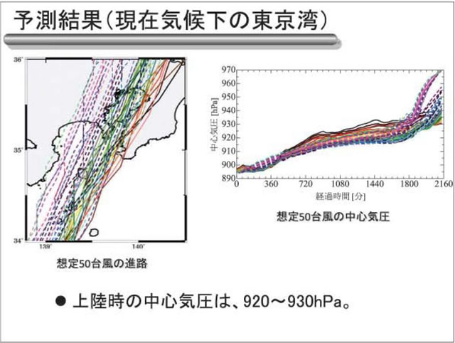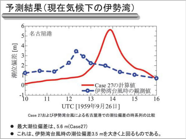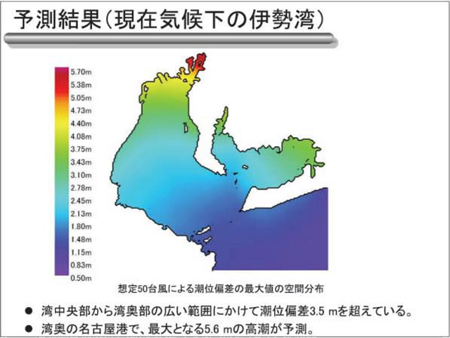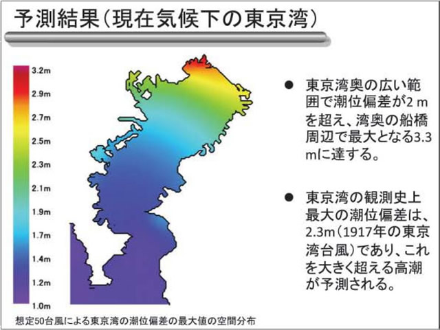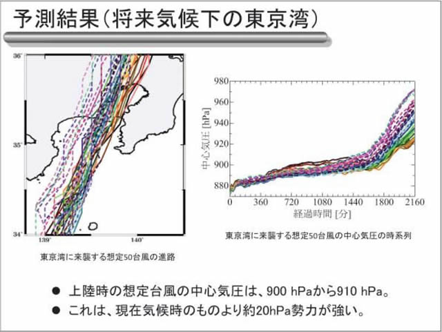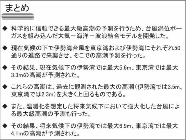その結果、現在気候の下で東京湾および伊勢湾において起こり得る最大級の高潮は、それぞれ3.3mおよび5.6mであることが明らかとなった。また、将来気候の下では、それぞれ4.1mおよび6.9mに達した。これらの高潮は、過去に観測された最大の高潮(伊勢湾台風(1959年)による3.5m、東京湾台風(1917年)による2.3m)を大きく上回るものである。