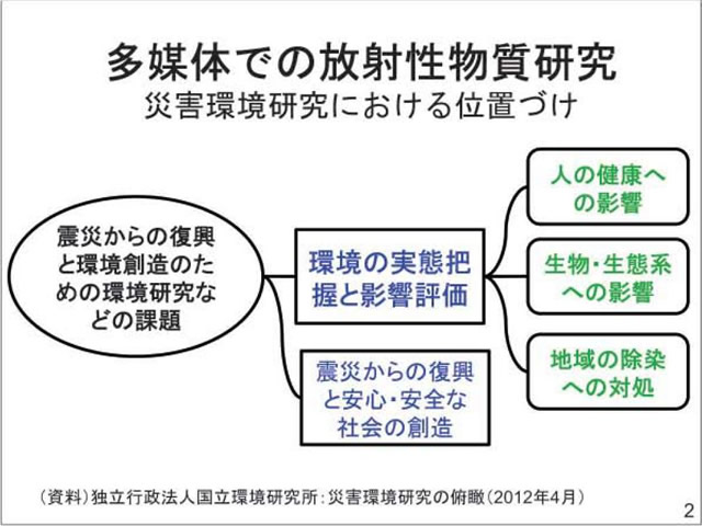 東日本大震災からの復旧・復興にあたり、環境中に拡散した放射性物質への対応を着実かつ早急に行うことが、喫緊の課題となっている。しかし、放射性物質によって一般環境が広く汚染される事態への対処は我が国で経験がなく、また、そのために必要な科学的知見が極めて不足している。