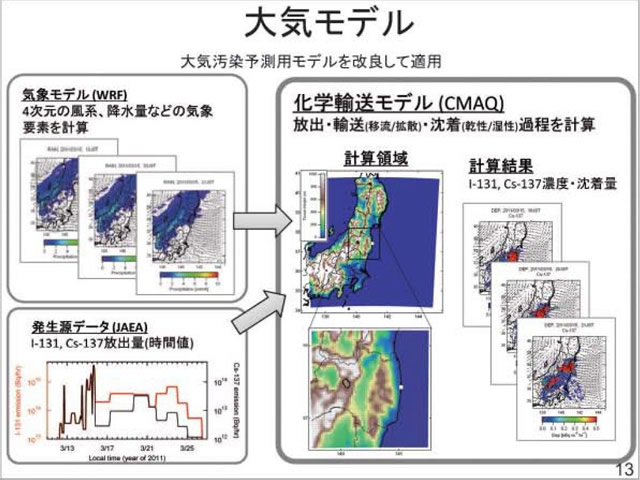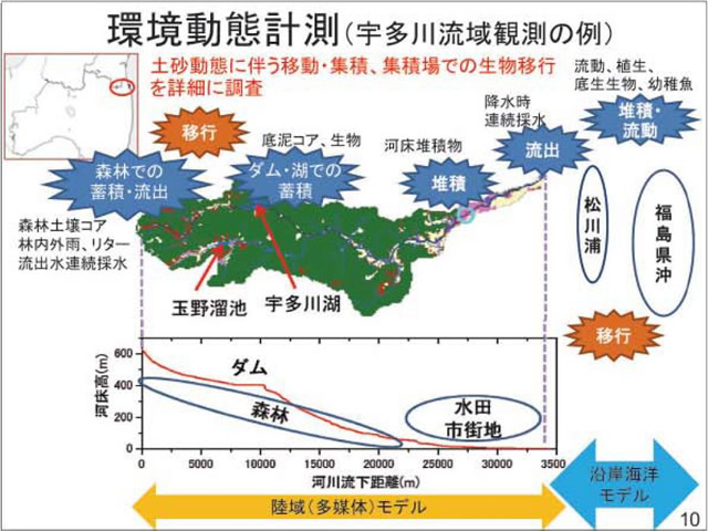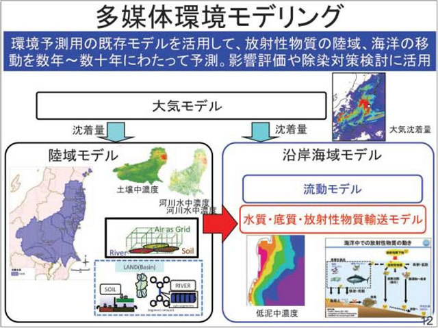 本研究は、多媒体環境での放射性物質の動態計測、モデリング、及び影響把握を研究の軸とする。多媒体環境モデリングでは、大気、土壌、森林、河川、湖沼、沿岸海域などの多媒体環境での放射性物質の挙動を把握し、将来予測するために、広域的な大気・陸域(多媒体)・沿岸海域を対象としたシミュレーションモデルを構築する。一方、環境動態計測では、重汚染地域として福島県東部の宇多川流域、軽汚染地域として霞ヶ浦流域を重点対象地域としたフィールド観測によって、放射性物質の実態と移行メカニズムを解明する。動態計測データをシミュレーションモデルの開発・検証に活用し、一方、モデルを使って動態メカニズムを解釈することにより、モデリングと動態計測を統合することによって、環境多媒体での汚染実態と放射性物質の蓄積・移動の実態を把握し、将来を予測する。更に、放射性物質による人と生物への影響を評価するために、人曝露量に関するモニタリング及びモデリングによる解析、植物・ほ乳類・菌類を対象とした遺伝的影響調査を実施する。